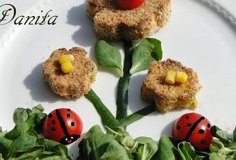 Mettere del pangrattato nel piatto e riempire le formine. passare anche il lato superiore e sformare.