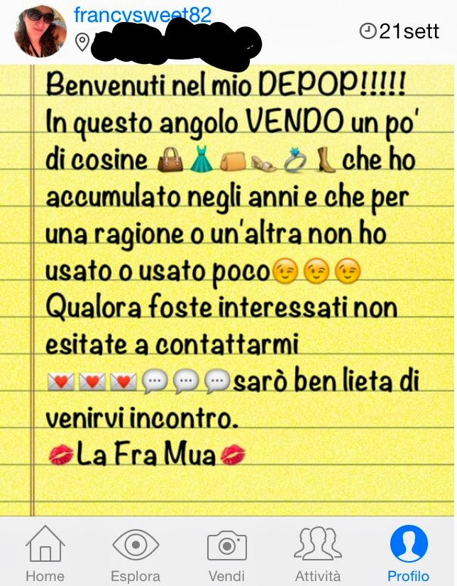 Mi ricorda un pò il "mercatino delle pulci" avete presente? Ora che ci sono,vi lascio anche dei suggerimenti per scattare foto perfette agli oggetti che vorreste mettere in vendita,qualora vi incuriosisse questa app. I creatori di Depop consigliano:Farsi fotografare mentre si indossa ciò che si vuole vendere.Fotografare l'oggetto che si vuole vendere alla luce naturaleNon fotografare con il flash o alla sera.Ciò che si vende deve essere ovvio.Non utilizzare immagini sfocate o con l'aggiunta di filtri.Provare a creare un set particolare per gli eventuali oggetti che si vogliono vendere.Non fare un collage fotografico.Si hanno 4 immagini a disposizione per fotografare anche i dettagli.Non fotografare l'oggetto in questione assieme ad altre cose che ne distolgono l'attenzione.Uno sfondo semplice e pulito aiuta a far risaltare l'oggetto da vendere.Trovare uno sfondo alternativo che faccia risaltare l'oggetto che vogliamo vendere.Non tagliare parti dell'oggetto che si vuole vendere.L'immagine principale deve rappresentare interamente ciò che si vuole vendere.Uno sfondo bianco fa sembrare l'oggetto che si vuole vendere fluttante nel nulla.Non usare fotografie prese da internet(almeno che non siano personali!!!)Scattate le vostre foto.Dimostrare l'autenticità della marca dell'oggetto che si vuole vendere( quindi fotografare etichette,garanzia,ricevute,certificati e quant' altro).Questo post non è assolutamente pubblicizzato da Depop,ma l'ho creato per sponsorizzare il MIO DEPOP