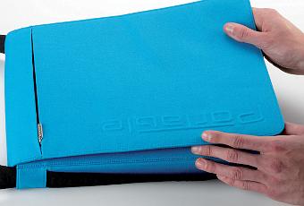 La caratteristica principale della borsa è la tracolla che, attraverso un sistema brevettato, gira intorno al perimetro e ne trattiene il contenuto. PorTable è dotata di una tasca esterna adatta a contenere il mouse, i cavi per l’alimentazione e anche accessori personali quali portachiavi, ipod o cellulare. Il logo Portable è applicato a rilievo direttamente sul tessuto. Il piano di appoggio per il portatile è realizzato in materiale tecnico termoformato provvisto di piedini a rilievo che garantisce sia la corretta ventilazione del computer che l’isolamento dal calore.