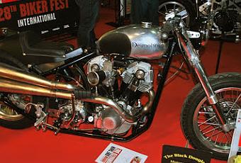 Durante il MBE di Verona un paio di settimane fa sono rimasto impressionato da questa moto. Ne avevo letto, ma non sapevo che fosse in Italia, parte della collezione privata della Black Douglas. Si tratta di un motore ibrido HD/Ducati 900SS montato su un telaio rigido Santee. Il motore è costituito da carter Ultima, pistoni Keith Black, alesaggio e corsa di serie, bielle Carillo e due testate del cilindro posteriore di una Ducati 900SS, cilindri artigianali appositamente realizzati da Axtell. "Non so cosa stavo pensando quando mi è venuta questa idea - dice Chris Barber, il costruttore e progettista di questa moto - vivevo negli Stati Uniti, lì per lì ho pensato che sarebbe stato divertente collocare teste Ducati su un motore Harley. Questo progetto ha ricevuto una maea di critiche ma io non l'ho realizzato per rendere il motore Harley qualcosa che non potrebbe mai essere, l'ho realizzato perchè potevo".
