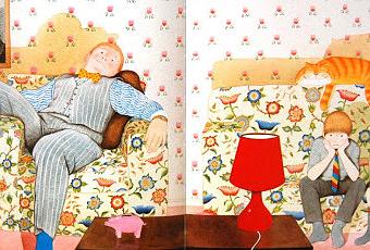 Le tavole illustrate dello stesso autore del testo, Anthony Browne, hanno un ritmo proprio che investe la narrazione testuale: giallo ocra quando la protagonista narrante è la madre, a sottolinearne solitudine e compostezza, colori brillanti e a tratti chiassosi, quando narrano del padre e dei figli. Sempre sorridenti le tre controparti mutano umore e tono quando la madre va via (allegorica anche la scomparsa della donna dal quadro con scena bucolica sul camino) per piombare in un buio triste e foriero di pessimi presagi (deliziosa l’ombra del lupo che si fa contorno netto sulla finestra). Quando la madre ritorna in scena agisce da luce, alba di un tempo nuovo, e da luce illumina tutto, inclusi i tre porcelli, restituendo loro un incarnato roseo affatto spento.