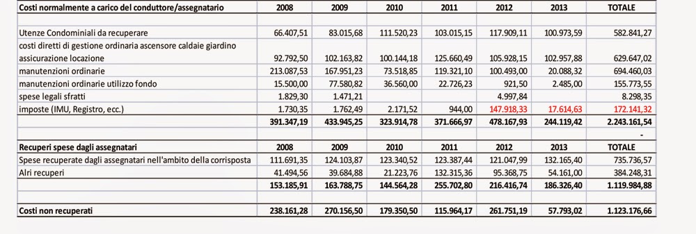 Un secondo aspetto riguarda il recupero delle spese di gestione a carico degli assegnatari. A questo riguardo il rilievo formulato è che la cooperativa non ha nel tempo recuperato per intero dagli assegnatari i costi di gestione degli alloggi di competenza dei medesimi. Il mancato recupero delle spese di gestione degli alloggi dagli assegnatari ha dunque inciso sull'aggravamento del dissesto in modo significativo (1.123.176,66 euro) nei sei anni presi in esame dal Commissario Giudiziale come vediamo da questa tabella: