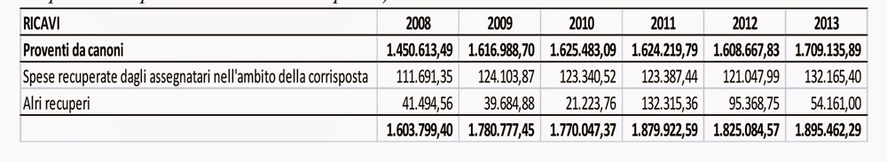 Riguardo ai canoni di godimento e di spese (indicate come "corrisposte") i minori introiti stabiliti nella misura di Euro 244.706,00 rispetto a quelli che si sarebbero determinati (a regime), questo per il solo 2013, analoga la cifra per il 2014. In termini generali si afferma nella relazione che la “Coop Di Vittorio nel 2011 applicava corrisposte (…) sensibilmente inferiori a quelle mediamente applicate su base regionale (…). Le corrisposte pagate dai Soci della Cooperativa Di Vittorio sono sistematicamente inferiori a quelle indicate dalla Legge 431/98. Il divario, pari al 20% ca. per gli immobili di recente costruzione, si accentua con l’aumentare dell’anzianità raggiungendo addirittura il 60%. L’anzianità media ponderata degli immobili in uso permanente è pari a 21 anni”. Per notizia segnaliamo che nell'arco temporale di riferimento (2008-2013) la cooperativa ha richiesto ai soci assegnatari il pagamento di canoni di godimento e di spese (ovvero corrisposte) della seguente entità: