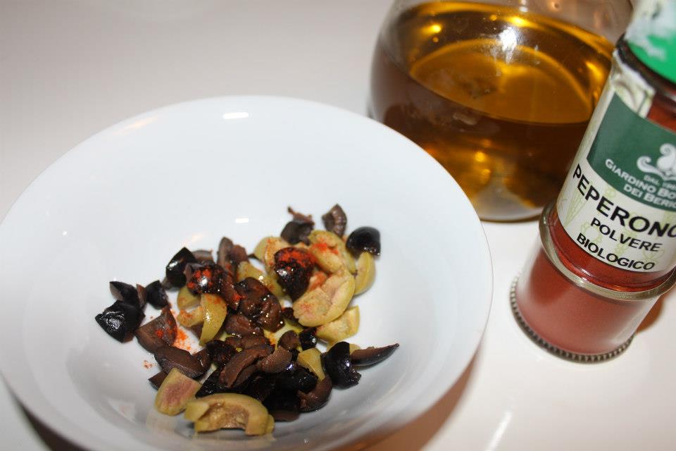 Tagliare le olive e condirle con un filo di olio e un pizzico di peperoncino, che oltre ad insaporire il piatto, aiuta ad accelerare il metabolismo e a spegnere la fame!!!Cut the olives and add a bit of oil and a bit of hot pepper! the hot pepper is used to flavor and to speed up the metabolism too!:-)