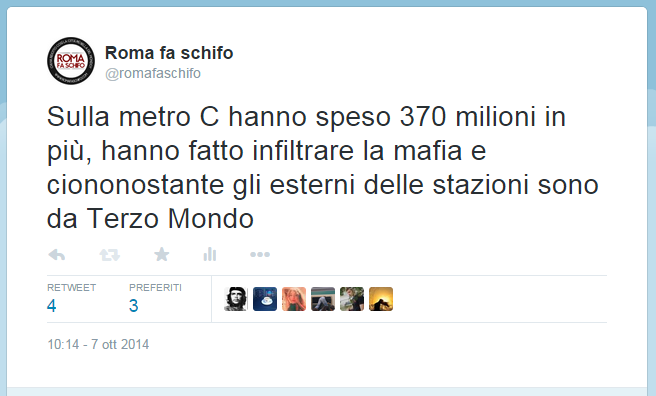 Ma non bastava, anche qui, controllare? Si sono presi tanti giorni per verificare le fonti, scrivono, e poi cadono in gaffe come questa? Ammettiamo la difficoltà di barcamenarsi tra decine di migliaia di tweet e post, ma delle due l'una: o si rinuncia a dimostrare teoremi inesistenti e inventati, oppure se lo si fa ci si prende la briga di lavorarci davvero. Non con la mano sinistra. E così siamo a novembre 2014 e finalmente l'infrastruttura apre, ma prima di allora, ad ottobre 2014 abbiamo trovato questo nostro tweet. Un attacco diretto al General Contractor: extra costi e infiltrazioni della malavita. Ma allora perché il pool di cervelli messi insieme da DinamoPresssostiene testualmente che Roma fa Schifo non fa cenno "al lievitare dei costi, alle infiltrazioni mafiose nei subappalti"? Semplice: lo sostiene solo per infangare, per diffamare, per calunniare, per gettare discredito su un progetto che sta cambiando la mentalità di tanti cittadini a Roma. Ma non contenti di chiamare in causa la mafia nel 2014, chiamammo anche in causa la 'Ndrangheta nell'aprile 2013. In questo tweet qui sotto che evidentemente il pool di diffamatori di DinamoPress non ha voluto considerare. Come è possibile che Roma fa Schifo stia attenta a non far male a Astaldi e poi lanci questi tweet? Chi ce lo spiega?Oh, sia chiaro: accanto a questi post di attacco su chi costruisce la metro troverete anche nella nostra time line decine di tweet che invece sono ampiamente a favore della linea. Siamo convinti che Roma si debba dotare di altre metropolitane per essere una città civile e lo sosteniamo da sempre. Quello che non sosteniamo, a differenza di ciò che afferma l'inchiesta diffamatoria, è chi costruisce speculando. Quelli li abbiamo sempre attaccati. Ma andiamo avanti, anche se questa è solo una piccola parte dei contenuti che si possono trovare sui nostri mezzi. Una parte dell'infrastruttura finalmente apre in periferia, dicevamo, e iniziano i nostri post di denuncia a valle dell'apertura. Basati sui manufatti che finalmente si potevano vedere e che finalmente (prima di allora non era possibile) i cittadini potevano segnalare.Sempre il 9 novembre 2014, giorno dell'apertura, facevamo en plein. Il tweet che vedete sopra, questo post Facebook e un post in cui si parla di "distruzione" dell'infrastruttura per mezzo dei vandali. Anzi, il post Facebook data 6 novembre: a rovinare la festa dell'inaugurazione. Eppure Roma fa Schifo viene raccontata come ufficio stampa di chi questa infrastruttura - fatiscente ancor prima di aprire - l'ha costruita. Il lancio Facebook qua sopra fa 300 condivisioni e viene visto da 50mila persone. Una bella operazione d'immagine pro-Astaldi non c'è che dire...In realtà anche a giugno 2014 parlavamo di sistemazioni superficiali (le sistemazioni superficiali le fa lo stesso Consorzio che scava le gallerie dunque ogni attacco su marciapiedi e progetto architettonico delle stazioni è un attacco al General Contractor e dunque, ci dispiace per loro, ad Astaldi) in questo articolo. DinamoPress scrive testualmente: "fino a dicembre 2014 non c'è mai una critica ai lavori". Giudicate voi mettendo insieme tutto il materiale qui sopra. E magari aggiungeteci, giusto per gradire, il tweet qui sotto.
