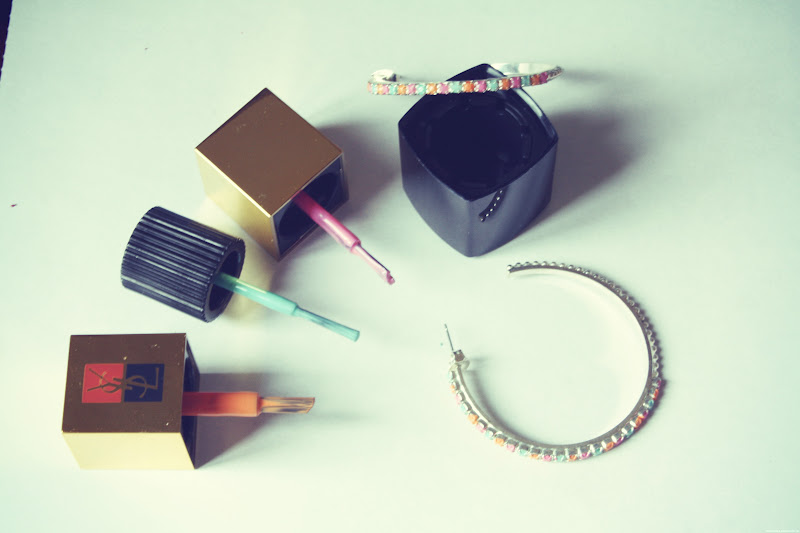 Lei anche nel blog di Laura di Purses&I (QUI) e di Andy di Stylescrapbook (QUI): gli allineamenti celesti mi dicevano che doveva essere mia.Ovviamente mi metto a studiare e altrettanto ovviamente scopro che in Italia la collana si trova solo.... a Venezia.Comodo.Vicino, soprattutto.Ora sto mobilitando tutte le mie conoscenze e le mie forze (faccia di bronzo compresa) e vedremo come finirà).Nel mentre mi consolo guardandomi intorno e cercando di realizzare un DIY casereccio che-di-più-non-si-può (tutto il web ne è pieno e io ne aggiungo uno: il mio) per produrre della bigiotteria "fine&elegante" per la primavera/estate 2012.Quello di cui necessitiamo sono:- bijoux tutti-tempestati-di-cristalli & affini vecchi o nuovi. Io volevo sperimentare ed ho riciclato due paia di vecchi orecchini che non usavo più- smalti colorati. Anche qui: potete comprarli nuovi, magari da Kiko o in qualche profumeria/banchetto del mercato da poco, del colore che volete. Perché magari non tutti hanno in casa smalti gialli fosforescenti o arancioni. O forse sì. Anche in questo caso, io ho aperto la mia scatola e pescato qualche smalto colorato- top coat trasparente.Gli smalti che ho utilizzato nel mio caso sono:per gli orecchini pseudo neon - rosa carico Kiko n.287- verde bosco Forever XXI (?)per gli orecchini pastello- Nouvelle Vague Chanel n.527- rosa e arancione Manucure Couture colour nail polish duo, edition 8top coat:- Seche Vite dry fast top coat