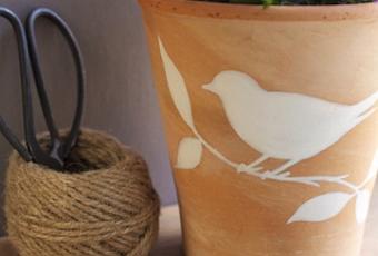 Se non avete dimestichezza con il disegno potete ricalcare una qualsiasi illustrazione con carta da lucido e simulando la carta carbone o utilizzate il disegno dell’uccellino in allegato, riempite il retro del foglio in corrispondenza del disegno con abbondanti tratti di grafite oppure utilizzate il disegno in allegato. Girate il foglio e ripassate i contorni dell’illustrazione riportandola sul vaso. Se poi volete procedere con poca fatica e molta resa, usate una mascherina stencil.