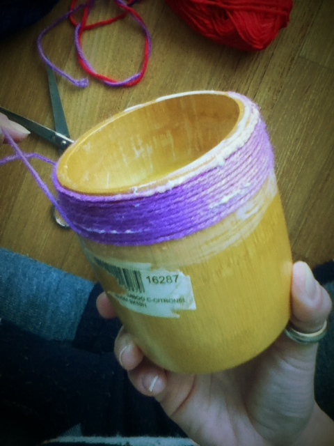 Tagliate il filo e assicuratelo sul retro con una buona dose di colla. Iniziate ad avvolgere nello stesso punto con un filo di colore diverso e proseguite così per tutto il contenitore. Date libero sfogo alla vostra creatività, usate tutti i colori e i fili a vostra disposizione e mixateli a piacimento.