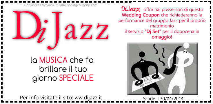 La Jazz-Band DiJazz offre a tutti gli Sposi che utilizzeranno questo Wedding Coupon e che richiederanno la performance del quintetto Jazz, un servizio di Dj-Set (in OMAGGIO!) per intrattenere i vostri ospiti fino a tarda notte con musica in grado di movimentare al meglio i momenti finali del vostro matrimonio!