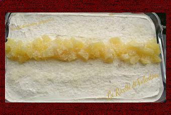 Coprite con uno strato sottile di crema, aiutandovi a tirarla bene con la spatola, procedete con i cubetti di ananas e altra crema.