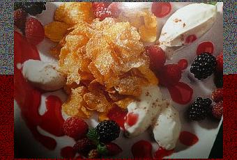 distribuite nei piatti le quenelle spolverizzate di zucchero a velo e completate con i cornflakes la salsa di lamponi le more e le fragoline decorando a piacere con foglie di basilico uno spettacolo