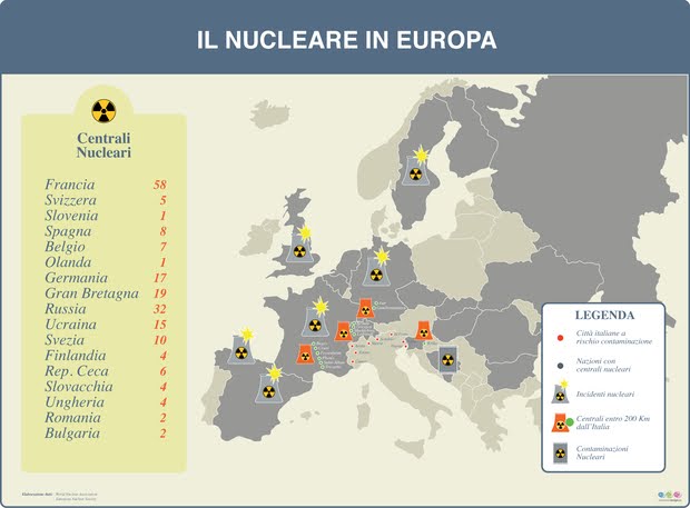 Sono 195 le centrali nucleari oggi attive in Europa. Tredici sono collocate a meno di 200 chilometri dai nostri confini. Le province italiane esposte a maggior rischio, secondo l'Agenzia Nazionale per la protezione ambientale, sono Cuneo, Torino, Aosta, Varese, Sondrio, Bolzano, Udine e Trieste.