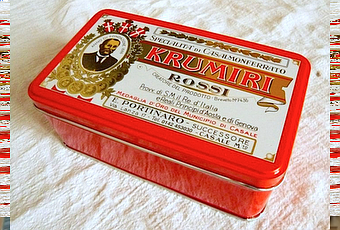 ricevere in dono una scatola di biscotti è oggigiorno un evento assai raro. ricevere in dono una scatola di biscotti in una pizzeria di periferia dove fanno una pizza eccezionale, durante una serata in cui si discetta di libri, di editing, di grafica e design è un gran piacere. poi vorresti che i krumiri rossi (prodotti a casale monferrato e dichiarati kasher dal vicerabbino capo della comunità ebraica di torino avraham reuven de wolff), modellati e confezionati a mano, che hai portato a casa e assaggiato in tutta la loro compatta delizia, non finissero mai, anche perché nella scatola di krumiri rossi hai trovato un foglietto che oltre alle informazioni storiche contiene i testi in onore dei krumiri di ottavio ottavi:Inno ai Krumiri
