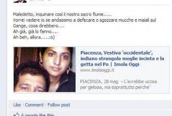 Padani sull'orlo di una crisi di nervi e di un trattamento sanitario obbligatorio. L'immagine qui sopra è tratta dal commento del leghista per l'indipenenza della patana, Luca Dordolo sull'omicidio avvenuto a Piacenza di una donna indiana, il cui cadavere è stato gettato nel po dal marito."Maledetti,inquinare il nostro sacro fiume, vorrei vedere se andassimoa defecare sul Gange"Insomma perdono voti ma non il cattivo gusto. Se cattivo gusto può chiamarsi il solito tentativo di addurre infamia sulle sciagure e sui defunti. Non v'è nulla di democratico e mai v'è stato in questo movimento che in qualsiasi altra parte del mondo, civile, non avrebbe alcuna cittadinanza.Ma siamo in Italia e ci si indigna per i fischi più che per la sostanza...