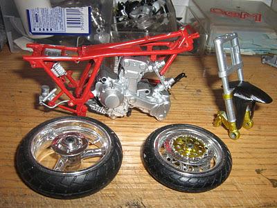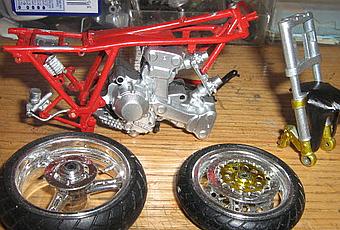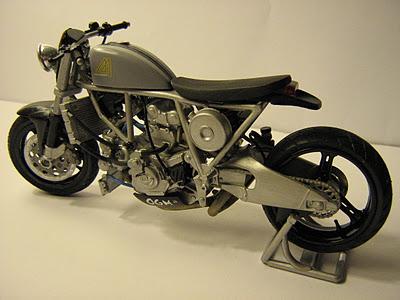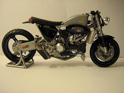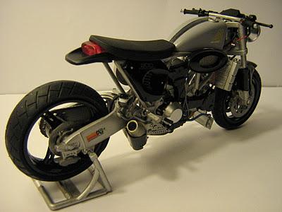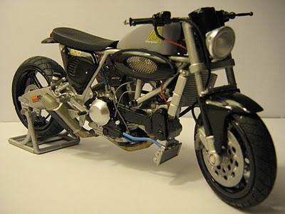 Al momento della costruzione ho cercato di valorizzare con piu' particolari possibili il motore che come detto in precedenza venendo da un modello da Autogrill e' assai scarsino di dettagli. Per ultimo ho modellato a caldo i nuovi collettori di scarico e per finale un silenziatore rielaborato di un BMW K100 e naturalmente una valanga di pazienza !" Luca