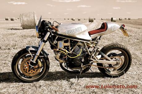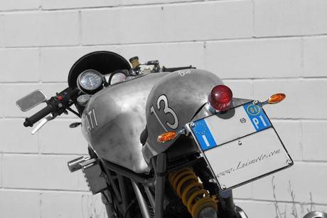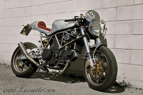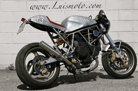 Faro anteriore Ducati Monster 900.Telaietto faro Ducati Monster 900 verniciato nero satinato.Staffa d'adattamento per telaietto Monster, costruita in alluminio e verniciata nero satinato.Supporti mascherina anteriore in alluminio verniciati nero satinatoPiastre forcella verniciate nero satinato.Piedini forcella verniciati nero satinato.Paratelaio aftermarket cromati.Clacson aftermarket cromato.Copribobina aftermarket cromato.Semimanubri Ducati Supersport anni '80.Struttura strumentazione Ducati Monster 900 modificata.Manopole Tommaselli anni '70Leva frizione accorciata.Frecce micro cromate.Portatarga con struttura in inox con cavi elettrici che passano internamente.Faro posteriore rotondo con spessore ricavato dal pieno per abbassarlo verso la targa il più possibile.Tappo serbatoio in alluminio ricavato dal pieno a vite.Specchio aftermarket cromato.Contrappesi costruiti.VerniciaturaEseguita da Luis effetto alluminio spazzolatoFoto: www.luismoto.it
