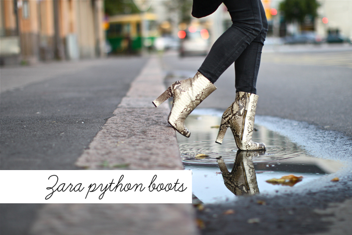 (5inchandup, theblondesalad, thechilicool, the glamurai, columbinesmile, Blameitonfashion)Dato che il pitonato è una stampa impegnativa forse non è il caso di andarsi a complicare ulteriormente la vita scegliendo proprio degli ankle boots. Optate per una clutch che va sempre bene, su, siate furbe se proprio dovete cedere ai trend di stagione.Questi stivaletti proposti da Zara (appena appena ispirati a dei vecchi Dries o sbaglio?) hanno una forma carina, devo ammetterlo. L'altezza poco sopra la caviglia mi piace e il tacco è proprio bellino ma, data la forma, escluderei di infilarci dentro dei pantaloni soprattutto se non sono super skinny e fanno fastidiose grinze in zona caviglia. In secondo luogo se c'è una cerniera è bene usarla. Allacciateli, non vedete che sembra debbano scapparvi da un momento all'altro se li lasciate aperti? E infine perché lanciarsi coraggiosamente nell'abbinamento di due fantasie animalier così diverse come il pitonato e il leopardato sapendo già che il risultato non potrà essere niente meno che disastroso?