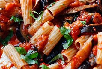 Intanto lavare e asciugare le melanzane, tagliarle a dadini, friggerle in abbondante olio bollente e poi lasciarle asciugare su carta da cucina. Quando il sugo e le melanzane saranno pronti, far bollire l’acqua in una pentola alta, calare la pasta e aggiustare di sale e lasciar cuocere il tempo necessario.