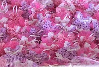 Applicati a sacchettini d'organza rosa,contenenti al loro interno cinque differenti degustazioni di confettie bigliettino personalizzato con nome e data.