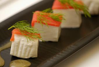 E per l'aperitivo un gustoso Finger Food: salmone selvaggio sockeye dell'Alaska, primo sale, aneto e miele di agrumi