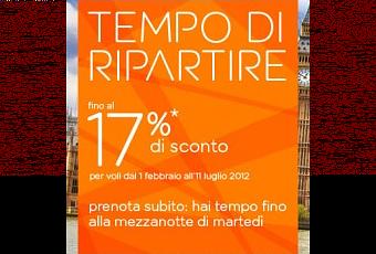 La promozione “tempo di ripartire” prevede fino al 17% di sconto per voli dall’1 febbraio all’11 luglio 2012