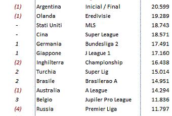 Nel 2014 hanno scalato posizioni i campionati di Francia, Giappone, Turchia, Brasile e Belgio, mentre si è affacciata per la prima volta nella Top 25 la Superligaen danese. In calo rispetto all'anno precedente Messico (proprio a scapito della Serie A), Argentina, Olanda, Australia, Russia, Ucraina e Svizzera.