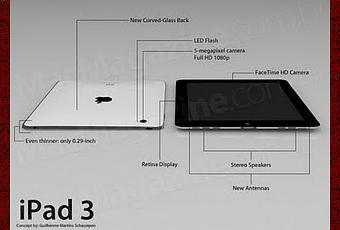 Il prossimo iPad come si può vedere dalle foto secondo Guilherme Martins Schasiepen, sarà ancora più sottile , vetro curvo nel posteriore , una fotocamera da 5 megapixel con LED flash, registrazioni video Full HD 1080p, nuova disposizione delle antenne e degli altoparlanti, con l'aggiunta della retina display e una fotocamera frontale in hd.