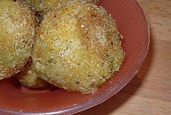 Fare a cubetti i gambi dei broccoli (io ho usato il broccolo romano) e saltarli in padell con lo spicchio di aglio e un cucchiaio di olio per circa 5 minuti. Togliere l'aglio e aggiungere un mestolo di brodo, facendolo consumare a fiamma bassa. Togliere dal fuoco e lasciare intiepidire. Inumidire il pane e sbriciolarlo con le dita. In una ciotola unire ai gambi un uovo, il formaggio, metà del pane sbriciolato, sale, pepe e noce moscata.Amalgamare e formare delle palline. Passarle prima nell'uovo leggermente sbattuto e poi nel restante pane sbriciolato. Far dorare le polpette in una padella con poco olio caldo, doradole su tutti i lati.