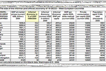 Tabella dell'economia ufficiale e di quella non ufficiale di 16 paesi OCSE