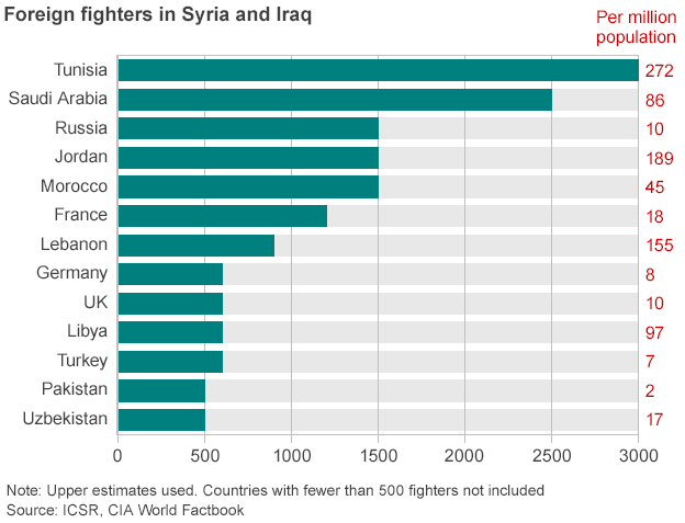 Tuttavia, a dispetto della qualità della rete internet, gli arruolati arrivati in Siria ed in Iraq provenienti dal nostro Occidente è pari a meno di un quinto del totale. La restante parte è infatti arrivata da stati africani quali Tunisia ed Arabia Saudita. Ciò non significa che l'occidente è totalmente apatico alle questioni dello Stato Islamico, ma anzi, anche grazie ai re-twitt dei ragazzi provenienti dal nostro spicchio di mondo è stato possibile arrivare con maggior facilità al cuore dell'Africa settentrionale.