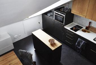 Dalla zona pranzo-cucina una scala in ferro nero conduce al piano superiore dove è stato ricavato il soggiorno e la camera da letto. La mansarda è decisamente luminosa grazie ai grandi lucernari che lasciano penetrare moltissima luce naturale e al bianco totale scelto per mobili, complementi, pareti e soffitti.