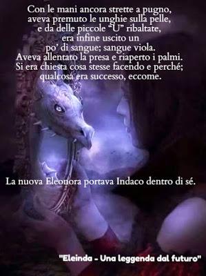 "... era corsa da Indaco per cercare nuovamente di fermarlo. Lo aveva raggiunto e gli si era piazzata davanti, con le mani gli aveva preso il muso e l’aveva afferrato con decisione: «Indaco, io...» Lo aveva guardato a lungo, fisso negli occhi. Gli aveva dato un bacio sul naso, poi, tremando, aveva invece deciso di lasciarlo andare. Appena il drago era uscito dal suo campo visivo, la ragazza aveva provato un violento strappo al cuore, poi alla mente. Un graffio nell’anima. Si era accasciata a terra con i pugni stretti a coprire gli occhi. Li aveva riaperti sollevando lo sguardo nella sciocca speranza che avrebbe visto il drago tornare indietro. Il cielo era fin troppo limpido quel giorno. Gli uccellini cantavano troppo allegramente. I fiori profumavano troppo. La gente che poteva sentire poco lontano da lì rideva troppo. Fuori era troppo, e dentro era vuoto. Era al punto di partenza, nell’esatta condizione di un anno prima: lei con se stessa. Era arrivata a pensare che forse non aveva vissuto nulla, che quello che c’era stato finora era solo un sogno o una fantasia. Con le mani ancora strette a pugno, aveva premuto le unghie sulla pelle, e da delle piccole “U” ribaltate, era infine uscito un po’ di sangue; sangue viola. Aveva allentato la presa e riaperto i palmi. Si era chiesta cosa stesse facendo e perché; qualcosa era successo, eccome. La nuova Eleonora portava Indaco dentro di sé."