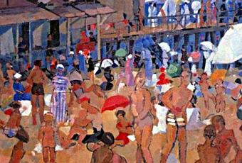 Ma è quando l'estate nuda conduce in ritmo la danza delle sue ore sotto i pini, o armonizza la spiaggia - che è tutta un fulvo barbaglio fiorito d'ombrelloni luminosi e di femmine versicolori - con i carichi verdazzurri dell'acqua, che Moses Levy si libera ai suoi inni di tutte le possibilità emotive e rappresentative che differenziano la sua opera fra mille ...