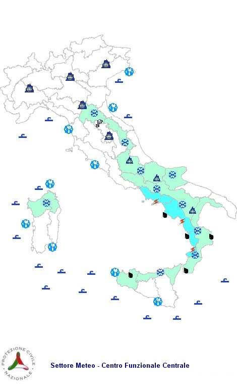 - al di sopra dei 200-400 metri sui restanti settori di Campania, Basilicata e Puglia e sulla Calabria settentrionale, con apporti al suolo da deboli a moderati, puntualmente elevati su Campania e Calabria;