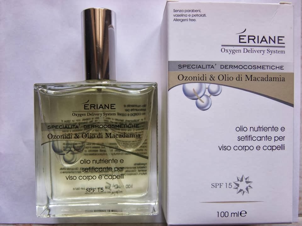 E' composto da principi attivi fra cui olio di Macadamia, Olio Ozonizzato e Vitamina E, che fonde diverse attività per nutrire, addolcire e rendere setosa la pelle e proteggere i capelli. Può essere utilizzato sia d’inverno sia d’estate. Prima dell’esposizione al sole protegge la pelle e i capelli dai raggi UV. Probabilmente non tutti conoscono le proprietà dell'olio ozonizzato L'olio ozonizzato contiene ozono che viene poi rilasciato gradualmente, producendo un'azione stimolante della circolazione del sangue.L'effetto stimolante dell'ozono sulla circolazione del sangue, vasodilatatorio, anti-infiammatorio e disinfettante, rendono il trattamento assolutamente consigliato, non solo per la cellulite, ma anche in caso di disturbi della circolazione periferica (varici, edemi), dermatologici (eczema, ulcere) e reumatologici (artrosi, artrite). La prima applicazione è stata fatta sui miei capelli prima di fare lo shampoo tenendolo in posa per almeno 15-20 min , in quanto ha una funzione ristrutturante.Di recente ho fatto il colore e , si sa l'uso di tinte a lungo andare può rendere più fragile il fusto , ho preparato questo impacco. Infatti i capelli si presentano luminosi, il crespo è un lontano ricordo .Questo è solo uno dei prodotti che vi mostrerò nel corso della settimana .Nel frattempo visitate il sitohttp://www.erianelab.com/