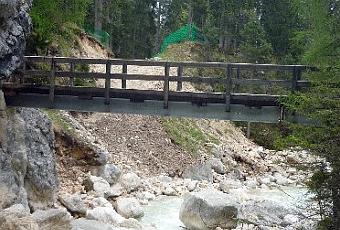 Torniamo nei nostri passi passando nuovamente dietro la cascata e ritorniamo alla deviazione dove eravamo stati prima. Da qui seguiamo le indicazioni per il sentiero dei canyons e delle cascate che ci porta, attraverso un ponticello di legno, vicino alla bellissima cascata di sopra e poi, con delle ripide scale, costeggiamo un'altissima parete rocciosa, detta sbarco di Fanes.