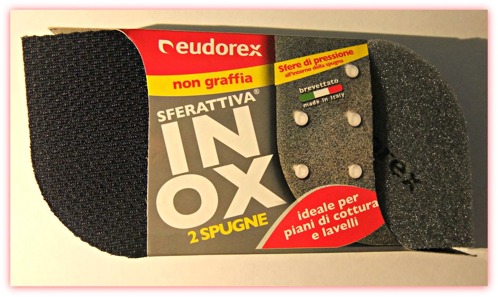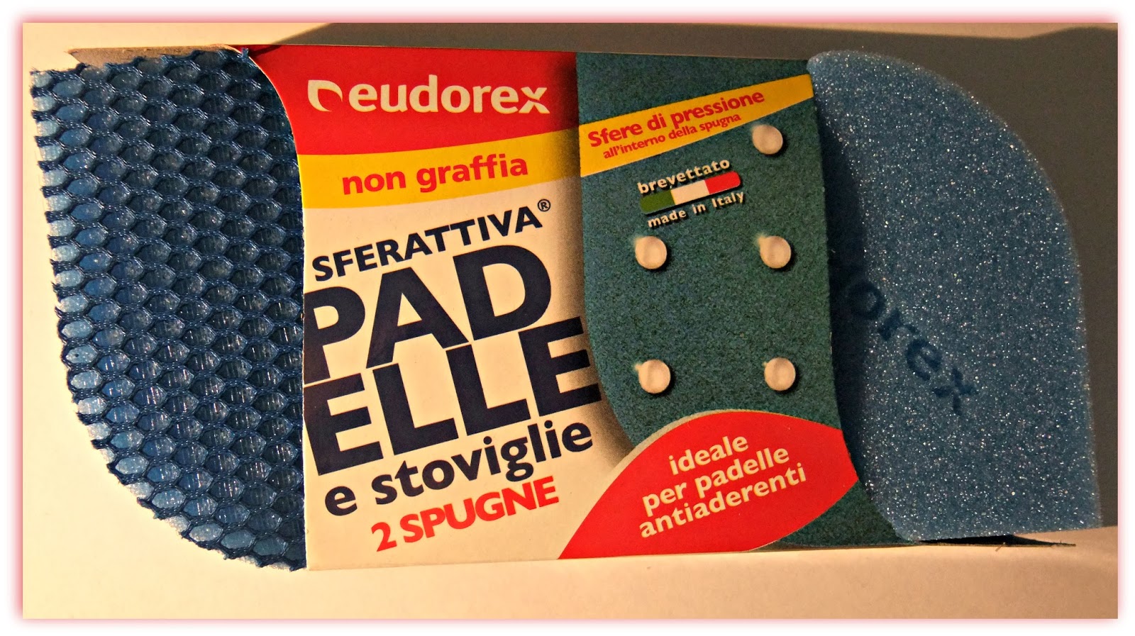 Pulizia facile grazie alle sfere di pressione: Le sfere di pressione sono un brevetto Eudorex: all'interno della spugna SFERATTIVA sono posizionate delle sfere poliuretaniche che amplificano la forza applicata dalle dita sulla superficie. Pulizia sicura grazie alla RETEATTIVA: Testato su padelle antiaderenti (teflon, ceramica ecc) rimuove lo sporco senza rovinare le superfici e dura 3 volte una fibra normale. Non trattiene residui di cibo, si lava facilmente. Lavabile in lavastoviglie La forma ergonomica della foglia facilita l'impugnatura e la pulizia negli angoli. Ottime per il lavello e il piano cottura, disincrostano perfettamente , per un pulito impeccabile...
