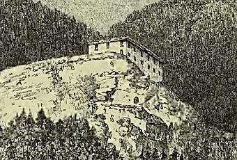 Da tutti i lati scendono monti neri coperti di abeti con erto pendio, sino alla stretta valle, dalle acque fredde, e dai prati verdeggianti, su cui pascola tranquillamente un gregge di pecore. A sinistra una gigantesca roccia spicca sul fondo nero della montagna, quasi un'eterna minaccia sospesa sul convento: è il Paradisino colla sua Casina rosa, che ripete in piccolo la nota data dalla costruzione che trovammo più in basso.