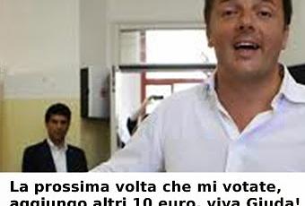 Ci sta tutta. Tra la crisi e l’inflazione, tra la disoccupazione e il leasing fatto per andare in vacanza (ma chi cazzo ha fatto mai passare l’idea che bisogna andare per forza in vacanza?), 30 denari non bastano più: ne occorrono almeno 80, quelli che ha dato loro il signor Renzi e che pagheremo noi facendoci ulteriormente il culo sul nostro lavoro! In sintesi, gli italiani sono affetti dalla sindrome di Giuda. Una famiglia media con quella cifra risolve niente, al massimo va in pizzeria qualche volta, ma loro si sono venduti lo stesso. Quindi e riassumendo, trionfoRenzi, ridimensionamentoGrillo che ha comunque conservato la forza propulsiva iniziale, delusioneBerlusconi. Leelezioni Europee e Comunalisi sono trasformate in un vero plebiscito per ilPartito democratico, il cui consenso (seppur con i dati ancora parziali) è andato al di là di ogni più rosea aspettativa. Lo dicono i dati, che parlano di una vittoria schiacciante per i democratici: ilPd è al 41%dei consensi. Un plebiscito, sia per il partito che per il suo leader, con il voto che ha rappresentato un test sull’operato dell’esecutivo. Lo stesso Renzi, del resto non ha nascosto la sua gioia: “Un risultato storico. Sono commosso e determinato adesso al lavoro per un’Italia che cambi l’Europa”.