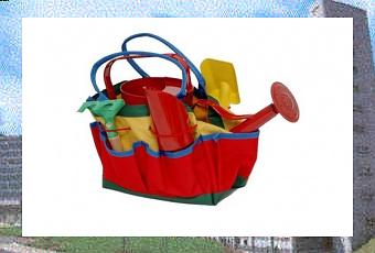 Mia suocera, al contrario, ama i fiori, curarli, ama passare il suo tempo in giardino ed ha provato più volte ad insegnarmi almeno i nomi delle piante e dei fiori ma dopo svariati tentativi ha alzato bandiera bianca! Ginevra, al contarrio e per fortuna, le sta dietro, la segue nell’annaffiare le piante e nell’ammirare i fiori e ne sono felice!! Mi piacerebbe che nonna e nipote avessero questa passione in comune e che potesse diventare una cosa tutta loro! E visto che la pupetta passerà del tempo al lago dai nonni le ho regalato il suo set personale da giardinaggio: un annaffiatoio tutto rosso in metallo, tre minuscoli attrezzi (rastrello e due diversi tipi di paletta) sempre in metallo con il manico in legno. Il tutto in una borsa colorata in cotone con sei tasche portaoggetti !!!! Lo si può trovare alla Città del Sole.