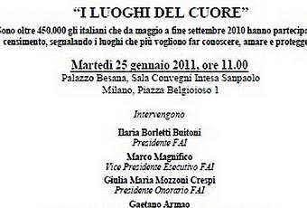 è con piacere che vi comunichiamo che il prossimo 25 gennaio avrà luogo a Milano, presso Palazzo Besana, la conferenza stampa nazionale di annuncio dei risultati del quinto censimento "I Luoghi del Cuore".In allegato potete trovare l'invito alla conferenza stampa.La partecipazione alla conferenza è aperta a tutti; visti i tempi stretti dell'evento e il numero consistente di relatori non potremo offrirvi la possibilità di un intervento e non sarà possibile presentare tutti i luoghi che avete fatto segnalare ma la conferenza sarà l'occasione per conoscere di prima mano, se lo desiderate, i risultati straordinari di questa quinta edizione del censimento. A partire dal 25 gennaio stesso potrete inoltre consultare sul sito internet www.iluoghidelcuore.it la classifica definitiva dei luoghi del cuore, che comprende le segnalazioni on line e quelle cartacee.Vorremmo infine ringraziarvi per la passione con cui avete partecipato al censimento e per l'impegno con cui avete raccolto segnalazioni a favore del vostro luogo del cuore.Non esitate ad inviarci eventuali aggiornamenti sui beni che avete segnalato, qualsiasi informazione sarà per noi utile per conoscere meglio il vostro luogo del cuore.Un saluto cordiale,Irene"