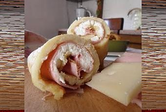 Per prima cosa preparate la vostra "crema" per le false crepes. E così in un recipiente mettete la farina con un pizzico di sale, nel mentre filo a filo aggiungete l'acqua frizzate, e iniziate a mescolare. Una volta che avrete reso omogeneo il composto aggiungetevi le uova precedentemente sbattute con un pizzico di pepe per dare un po' di corpo. E con un frusta incorporatevi al composto le uovo, deve risultare omogeneo e fluido. Nel mentre mettete a scaldare un padellino, il mio ha diametro 20cm e la crepes resta piccolina, adatta anche come aperitivo. Prima che il padellino si scaldi troppo, con un pezzo di carta da cucina imbevuto in una lacrima di olio passatelo sul pentolino, così non si attacca. E con l'aiuto di un mestolo versatevi il composto, stendetelo bene a coprire tutti i bordi e fate cuocere a fuoco dolce. Una volta che si sarà staccato da sotto giratelo, dalla parte opposta facendo attenzione a non romperlo. Cuocete il tutto fino a che non risulta dorato e leggermente croccante. Una volta pronte lasciatele intiepidire su un piatto, e una volta che non saranno più bollenti possiamo andare a farcirle. Adagiate la fetta di prosciutto cotto e sopra il tomino e spalmatelo bene su tutta la crepes. Una volta farcita, delicatamente richiudetela facendo molta attenzione a non romperla. e lasciatela riposare in frigo. Quando dovete servirla se volete potete tagliarla a metà e servirla infilzata in uno stuzzicadenti oppure spiedino, risulterà un'ottima idea per un aperitivo fresco estivo.