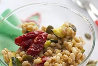 Servite il farro con zucchine e pomodori secchi ancora caldo.
