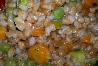 farro integrale con verdure e pomodori, una ricetta molto buona e sana, adoro i cereali integrali ma fino ad oggi ho preparato i cereali perlati come il farro, il grano e l'orzo ma questa volta ho voluto preparare il farro integrale perchè le sue proprietà nutritive sono molto più vantaggiose, il farro è ricco di fibre, proteine e carboidrati, vitamine, è rinfrescante, energetico