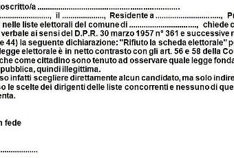 Sono andata. Direi che, nonostante il tentativo di farmi desistere e nonostante sia stata la prima nel seggio a rifiutare le schede elettorali, il tutto si è risolto abbastanza velocemente. Anche perchè mi ero premunita: ho scaricato da qui il modulo, l'ho stampato in due copie e le ho sottoscritte e firmate. Al seggio ho presentato i documenti e la tessera elettorale. Non ho ritirato le schede e ho detto a chi mi stava davanti che rifiutavo per le motivazioni esposte nei fogli che presentavo. Dopo un primo attimo di perplessità, mi hanno apposto il timbro sia sulla tessera elettorale che sulle mie dichiarazioni, hanno annotato sul registro con matita il mio diniego e su un altro registro a penna la mia dichiarazione con l'allegato che avevo portato. Alla fine del registro, in una pagina apposita, c'erano i numeri delle persone che hanno rifiutato ed è stato lì che ho notato di essere stata la prima (spero non l'ultima).