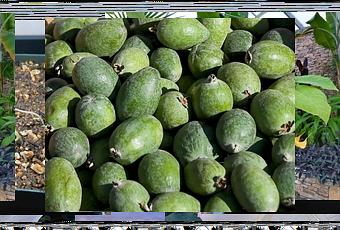 La feijoa è il frutto che viene prodotto dalla Feijoa sellowiana detta anche Acca sellowiana. La pianta è un arbusto sempreverde originario degli altipiani montani dell'America Latina, principalmente del Brasile meridionale e del nord dell'Argentina. Appartiene alla famiglia delle Myrtaceae e può arrivare fino ai sette metri di altezza. Le foglie sono di colore scuro e lucente, sono spesse e raggiungono i cinque centimetri di diametro, mentre i fiori sono abbastanza piccoli e di colore bianco e di un rosa tendente al viola, ma caratterizzati da stami di colore rossastro. Sia le foglie che i fiori vengono utilizzati in cucina: le foglie essiccate per preparare tisane, i fiori trovano spazio in insalate oppure vengono degustati da soli per il loro sapore dolciastro. Anche se originaria del Sud America, quindi avvezza a un clima quasi tropicale, la feijoa resiste anche a temperature che scendono di qualche grado sotto lo zero. Questo ne ha permesso la coltivazione e la diffusione anche in Italia e in altre regioni a clima temperato.