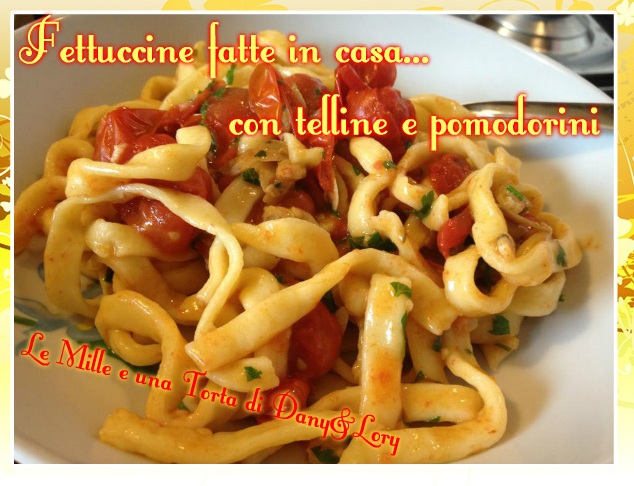 Impastare prima gli ingredienti x fare la pasta. Una volta formata una palla farla riposare 10 minuti. Nel frattempo cuocere le telline e una volta aperte separarle dalla loro acqua di cottura e farla addensare x togliere gli eventuali residui di sabbia. Io, avendole congelate, questo procedimento lo avevo gia' fatto. Ho quindi sbucciato uno spicchio d'aglio e l'ho messo in una padella con un filo d'olio , ho aggiunto le telline sgusciate e ho fatto soffriggere il tutto per qualche secondo. Ho aggiunto il vino e ho fatto sfumare. Ho poi versato l'acqua di cottura delle telline e dopo circa 1 minuto i pomodorini interi. Ho fatto cuocere il sughetto x circa 7-8 inuti, il tempo di far cuocere i pomodorini. Nel frattempo ho messo a bollire l'acqua e ho preparato le fettuccine, passando la pasta nell'apposita macchina. Ho cotto le fettuccine giusto il tempo di iniziare a bollire e l'ho condite con il sughetto aggiungendo mezzo bicchiere di acqua di cottura x evitare che si asciughino troppo.