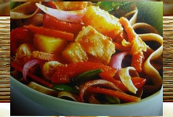 in una padella versare 320 g di ananas la salsa e le fettuccine e fate saltare per 5'