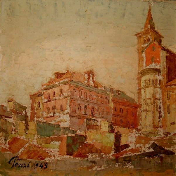 Il porticato del Duomo Nel 1945 e poi nel 1946 Ettore Ponzi ha dedicato numerosi quadri al porticato del duomo oggi non più esistente. Questo porticato collegava la sagrestia della cattedrale al vescovado che, danneggiato dai bombardamenti, fu totalmente distrutto nel primo dopoguerra per far posto all'attuale orribile sistemazione urbanistica del lato nord del duomo. Contemporaneamente, dalla parte opposta del duomo, veniva completata la demolizione dell'antico seminario vescovile. Ponzi assistette impotente a questi scempi che, più che mai solo, cercò di contrastare.