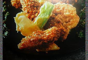 sbattete 2 uova immergetevi le verdure e passatele nella farina di riso quindi friggetele in abbondante olio di semi di arachide a 160 ° per 5 minuti facendole ben dorare